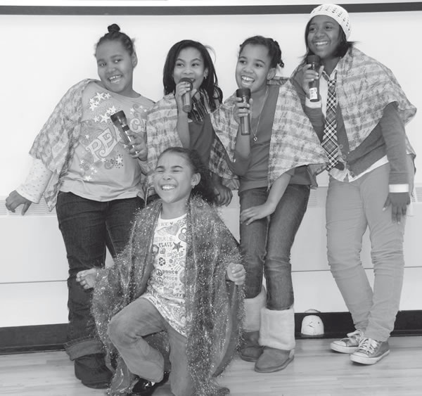 Girl groups are revived in “Flashback to Motown”, by the African American Children’s Theatre February 27. Qwantaae Lenyard (front) is backed by (l to r) Raven Tribune, LaMiracle Manago, Ciera Robbins, and Matia Williams. Photo by Sue Vliet.