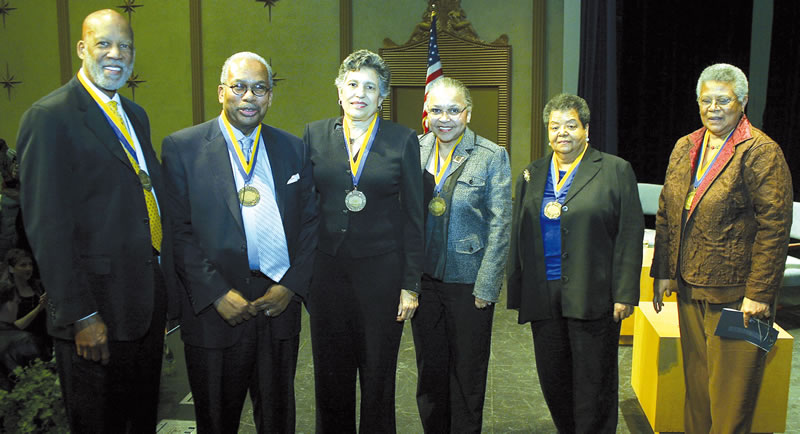 Six members of the Little Rock Nine accepted their Pere Marquette Discovery Awards, the university’s highest honor. Pictured from (l to r) are: Terrence Roberts, Ernest Green, Carlotta Walls LaNier, Gloria Ray Karlmark, Elizabeth Eckford and Minnijean Brown Trickey. Unable to make the trip but also recipients of the award are: Jefferson Brown, who could not make it due to the weather. Melba Pattillo Beals and Thelma Mothershed Wair were ill. (Photo by Robert A. Bell)