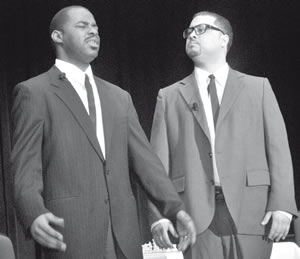 Hansberry Sands is presenting a production entitled ‘The Meeting’. The photo is a scene from the play depicting Dr. Martin Luther King Jr. and Malcolm X. Edward Johnson is playing Dr. King and Jason Townes is play Malcolm X. (photo by Harry Kemp)