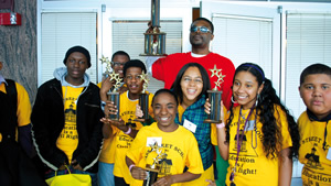 Team and coach from Cass Street Middle School celebrate their victory at the 2nd Annual Black Knowledge Bowl