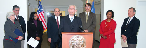 State Superintendent Tony Evers addresses the media during the announcement of the education reform legislation, surrounding him are Governor Jim Doyle, legislators and education leaders of Wisconsin. (Photo by Robert A. Bell)