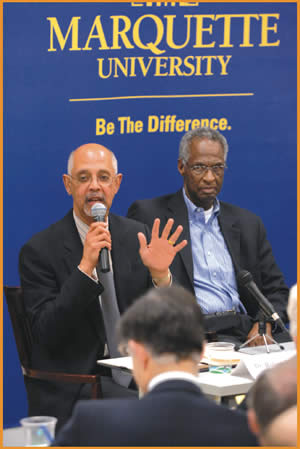 Dr. Robert S. Peterkin and Dr. Howard Fuller participated in a panel discussion held at Marquette University’s Law School recently. (Marquette Law School photo)