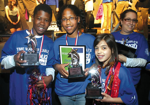 Celebrating at Time Warner Cable’s Hang Tough Video Contest are the Wisconsin on Demand channel 411 “Viewer’s Choice” winners from Milwaukee Spanish Immersion School, Terrance Banyard, Claudia Osborn, and Alicia Hernandez with their teacher Ms. Toni Fink. The entire Hang Tough awards premiere and all 30-second finalist PSAs can be seen on Time Warner Cable’s Wisconsin on Demand channel 411. (Photo by Robert A. Bell)