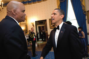President Barack Obama greets guest Will Allen in a receiving line in the Blue Room of the White House, May 19, 2010. (Official White House Photo by Samantha Appleton)
