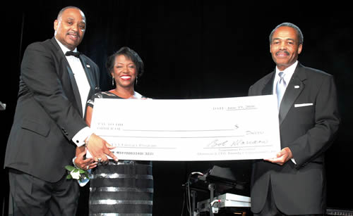 The Milwaukee Urban League held its annual Black and White Ball last weekend. A check for $20,000 from the Roundy’s Foundation for the Milwaukee Urban League’s “Campaign for African American Achievement” program was presented by Vivian King, director of public affairs for Roundy’s Supermarkets to Ralph Hollmon, president/CEO of The Milwaukee Urban League and to Jerry Fulmer, director of Supplier Diversity for We Energies/Wisconsin Energy Corporation and chairman of the board of the Milwaukee Urban League. The second check was presented for $75,000 from MillerCoors, presented by Larry Waters, director of multicultural relations at MillerCoors to Hollmon and Fulmer. (Photos by Robert A. Bell)