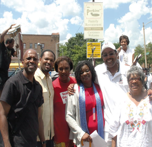 Common Council President Ald.Willie Hines, Jr., Ald. Ashanti Hamilton, Sen. Lena Taylor, Cong. Gwen Moore, Ald. Willie Wade and State Rep. Annette Polly Williams joined the Atkinson, Capitol, Teutonia (ACT) Business Improvement District as they celebrated the recent happenings of the group and honored the Perkins Family for their more than 42 years of contributions to the neighborhood. The public event took place on the triangle at Capitol Dr. and Atkinson Ave. Saturday, July 10. (Photo by Robert A. Bell)
