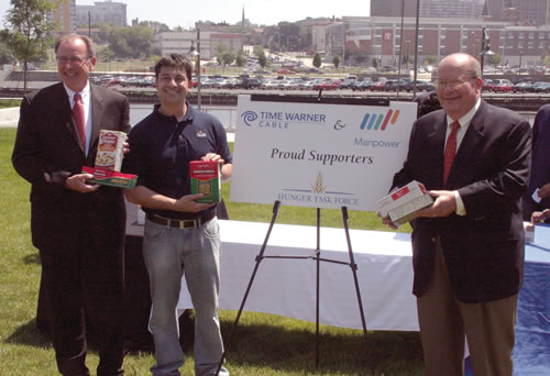 - Time Warner Cable and Manpower employees celebrated their collaborative efforts and commitment to fight hunger in Wisconsin as the totals of their food drive to benefit Hunger Task Force are announced. At Manpower’s invitation, the two companies recently, partnered to host a “River Walk Food Challenge.” Diversity Council members from each company led the efforts with a goal to make a bigger impact toward combating hunger through a joint initiative. Employees joined together to hear the announcement made by Hunger Task Force with the totals of their joint food drive collection. Pictured above from (l to r) are: Tom Adams, Time Warner Cable regional vp Operations; Scott Marshall, Hunger Task Force director of Development and Chuck Bartels, Manpower director of Global Social Responsibility. The total food collection was 3,300 between the two companies. This is the first time the two neighboring companies have joined together on a cause-related, community outreach initiative. (Photo by Robert A. Bell)