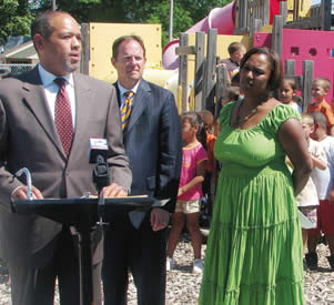 DCF Secretary Reggie Bicha made the YoungStar training and technical support announcement outside at the playground of one of Milwaukee’s highly regarded day care centers, Child Development Center of St. Joseph located at 1600 W. Oklahoma Ave. Also pictured showing support of the program is Senator Lena Taylor and Representative John Richards in the background. (DCF photo)