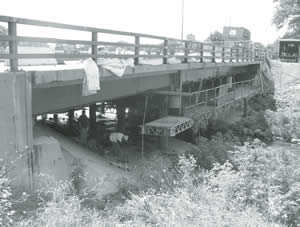 First, a scaffolding system with floor decking under a bridge across Lincoln Creek at N. 60th St. and (approximately) W. Hampton Ave. (see photo) greatly impeded the flow of storm water during the heavy rains. This system, installed by the Department of Public Works, had been in place for almost a year and a half for bridge repair maintenance, but as the photo reveals, it also served as an obstruction to heavy flow rates. In the neighborhood that surrounds this part of Lincoln Creek, water was not allowed to flow into the creek because the massive flow exceeded its capacity limits and because of the high level of water already in this conveyance system. Residents knew about the work being done, and during my visits to impacted areas they asked me to investigate the reason why the scaffolding system had been there so long.