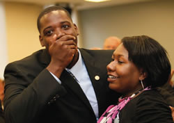 Tommy Walls, Jr. reacts with surprise after learning he won the 2010 Midwest Region Youth of the Year title for Boys & Girls Clubs of America. Natalie Cooper, director of teen services and urban outreach for Boys & Girls Clubs of Greater Milwaukee, congratulates him.
