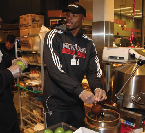 The entire Milwaukee Bucks Team surprised customers recently at Pick N Save’s Metro Market on Van Buren in downtown Milwaukee. The players worked the service counters in the deli department, the bakery, made carmel apples, bagged groceries etc. for a couple of hours. (Photo by Robert A. Bell)