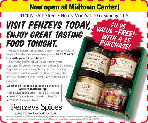 Just in time for the holiday season, Penzeys Spices has opened a new store in Midtown Center, at 4140 N. 56th Street. The store is a welcomed addition for the center, which has lost a number of retailers recently including the Lowes Home Improvement store and Applebee’s Restaurant.