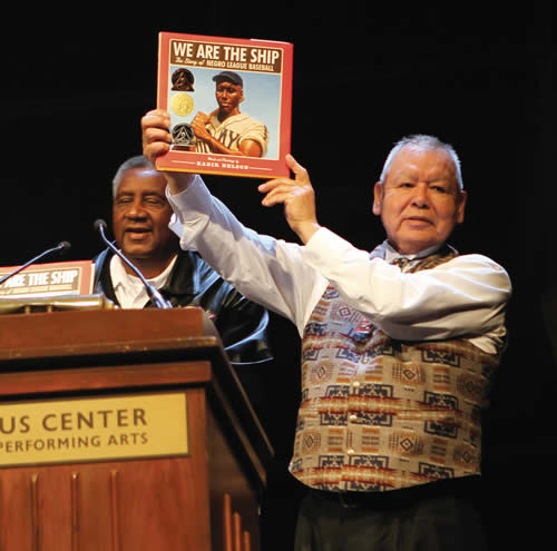 Harold Gus Frank, chairman of the Forest County Potawatomi. Frank along with Dennis “Bose” Biddle held up their appreciation gift presented to them following their addresses to the audience, a book entitled ‘We Are The Ship’. The Marcus Center event further demonstrates the diversity of the impact that Dr. King has had on cultures that reach beyond African Americans. (Photo by Pat A. Robinson)