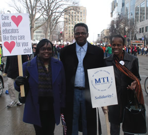 Milwaukeeans joined in on the protest efforts in Madison last week that are continuing through this week. From (l to r) Janet Davis, Mike Miller, and Kathy Harmon all from Milwaukee were part of the tens of thousands of protesters who want to ‘Kill the Walker Bill’. (Photo by Robert A. Bell)