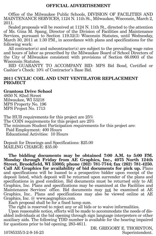 Share: Click to share on Facebook (Opens in new window) Facebook Tweet Click to email a link to a friend (Opens in new window) Email Click to print (Opens in new window) Print MPS Requesting BIDs for 2011 Cyclic Coil and Unit Ventilator Replacement at Grantosa Drive School March 5, 2011 Share: Click to share on Facebook (Opens in new window) Facebook Tweet Click to email a link to a friend (Opens in new window) Email Click to print (Opens in new window) Print