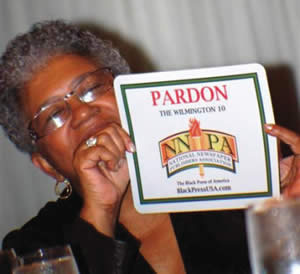 Dorothy R. Leavell, chairperson of the NNPA Foundation, holds up the mouse pad that NNPA Publishers have been asked to keep next to their computer as they embark upon the “Pardon The Wilmington 10” initiative. (Photo by Carole Geary)