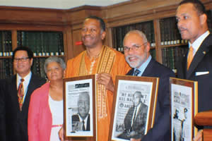 Dr. Clifford L. Muse, Jr., Howard University Archivist at the Moorland Spingarn Research Center and Dorothy R. Leavell, NNPA Foundation Chairperson; presided over the enshrinement ceremony for deceased publishers, Cloves Campbell, Sr. and Dr. Charles Campbell, publishers of the Arizona Informant; Charles W. Cherry, Sr., publisher of the Daytona Times and Florida Courier; and N.A. Sweets, publisher of the St. Louis American. Accepting plaques that will grace their offi ces and also the Gallery of Distinguished Black Publishers at Howard are descendants of the deceased publishers: Charles Cherry, II; Fred Sweets, and Cloves Campbell, Jr. (Photo by Carole Geary)
