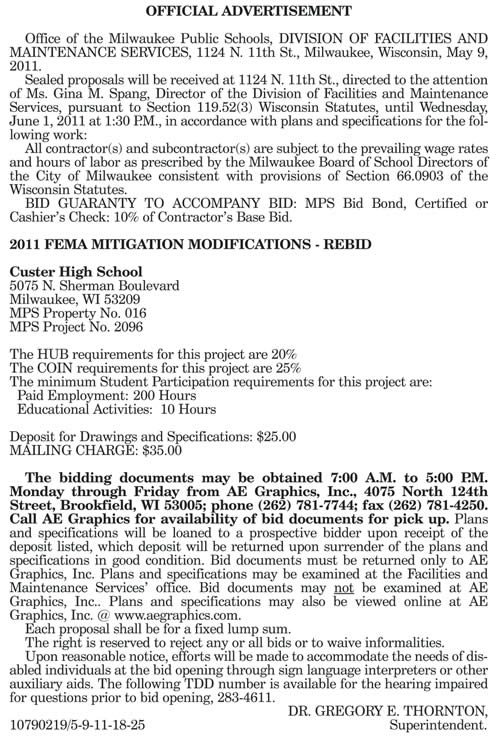 Share: Click to share on Facebook (Opens in new window) Facebook Tweet Click to email a link to a friend (Opens in new window) Email Click to print (Opens in new window) Print MPS Requesting BIDs For 2011 FEMA Mitigation Modifications – Rebid at Custer High School May 13, 2011 Share: Click to share on Facebook (Opens in new window) Facebook Tweet Click to email a link to a friend (Opens in new window) Email Click to print (Opens in new window) Print