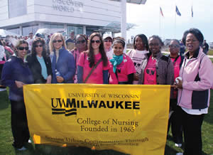Sandra Underwood, Professor UWM College of Nursing (far right) led a group of volunteers during the recent American Cancer Society’s ‘Making Strides Against Breast Cancer 5K’ held in Milwaukee on May 7. (Photo by Robert A. Bell)