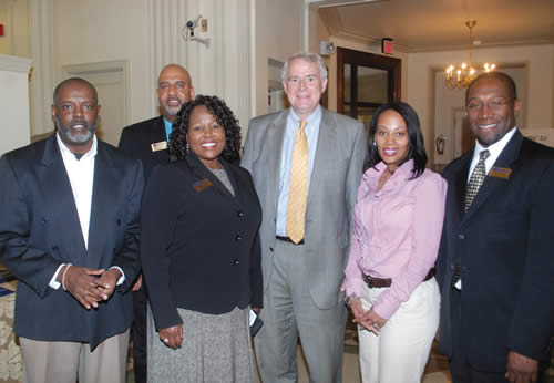 The Wisconsin Black Chamber of Commerce held a reception for community officials and staff of Seaway Bank and Trust Company, the renowned Black owned bank based out of Chicago that replaced Legacy Bank several months ago. Shown above welcoming the bank are from (l to r): Ruben Hopkins, president and CEO of the Wisconsin Black Chamber of Commerce, Inc; Robin Talbott, Seaway vice president-commercial lending,Arlene Carruthers-Williams, Seaway executive vice president-lending, Mayor Tom Barrett, Adrianne Hooker, president of Great Lakes School of Etiquette, and Tracy L. Meeks, Seaway senior vice-president/manager-North Division. (Photo by Yvonne Kemp)
