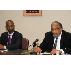 Milwaukee NAACP Branch president Atty. James Hall listens as R.L. McNeely, Ph.D, J.D. addresses the audience at Wednesday’s NAACP/UWM press conference. Dr. Mc- Neely one of the co-authors of the report; ‘Occasional Report of the NAACP Milwaukee Branch’ introduced the report at the press conference. (Photo by Robert A. Bell)