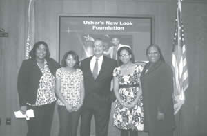 Darlene Austin, Quarles & Brady, LLP; Aubryanna Bowen, 2011 student scholarship recipient; John Daniels, chairman Quarles & Brady LP,; Gabryanna Bowen, 2011 student scholarship recipient; ReDonna Rodgers, Center for Teaching Entrepreneurship. The Bowen sisters’ attendance at the national Black Enterprise Entrepreneurial Conference in May was underwritten by the Fellowship Open.