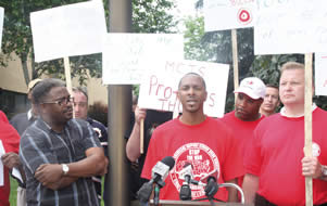 Milwaukee County Transit bus drivers called a rally and press conference on Monday, June 27 to share with the public that they are still being subjected to physical attacks as they try to do their jobs. Lamar ‘Penny’ Sikora (center), Legislative Director of the Local 998 union addresses the crowd as Alan Simonis (r),Local 998 Union president and Donald Woodson (l) listen as he explains the drivers’ position of a “zero tolerance” for these assaults. (Photo by Robert A. Bell)