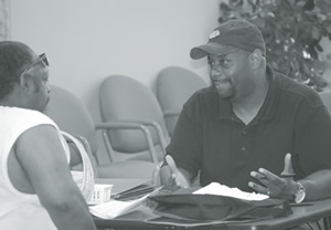 Judge Derek Mosley talks with a resident on how he can regain his drivers license at the SDC Job and Resource Fair.