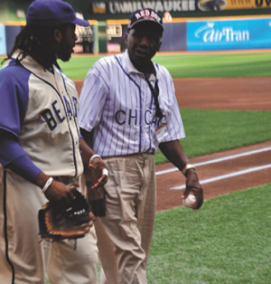 After throwing out the first pitch along-side Johnny “Lefty” Washington, Charlie “Whip” Davis strolls off the field with Brewers second baseman, Rickie Weeks.