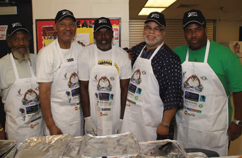 Some of the participants from the 12th Annual Men Who Cook event pause for a photo during the event held this past Saturday, July 30 at the Parklawn YMCA. Pictured from (l to r) Ahmad Khalid made Curry Chicken, Al Holmes made BBQ and Hot Wings, Ruben Hopkins made Chocolate Cake, Tyrone Dumas made Lucious Lemon Pie, and James Barnes made Gumbo and Jambalaya. First place winners included Al Holmes for his wings, Tyrone Dumas for his Lemon Pie and James Barnes for his Jambalaya. (Photo by Robert A. Bell)
