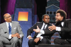 (Left to right) Michael Steele, president and CEO of The Steele Group Inc.; and Kasim Reed, Mayor of Atlanta, listen as Dr. Cornel West makes a point at the panel discussion, “Black Out or Black In?” during the NABJ. — Hiroko Tanaka/Tribune Staff Photographer