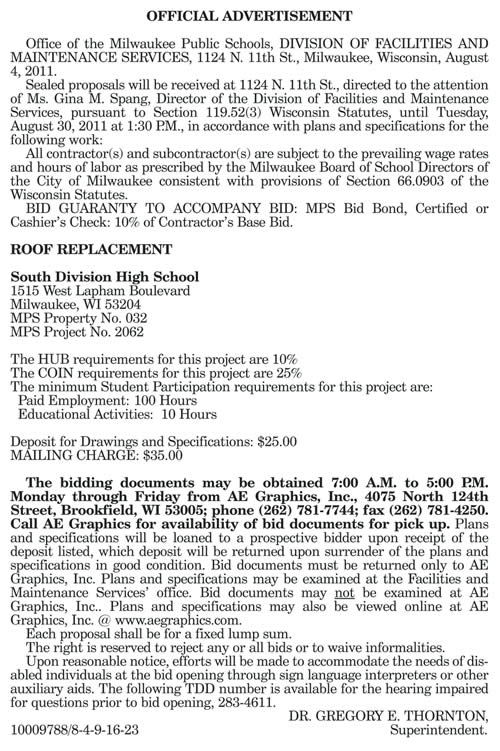 Share: Click to share on Facebook (Opens in new window) Facebook Tweet Click to email a link to a friend (Opens in new window) Email Click to print (Opens in new window) Print MPS Requesting BIDs for Roof Replacement at South Division High School August 13, 2011 Share: Click to share on Facebook (Opens in new window) Facebook Tweet Click to email a link to a friend (Opens in new window) Email Click to print (Opens in new window) Print