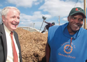 Mayor Tom Barret and Will Allen, president and CEO of Growing Power share a laugh at one of the many events held at Growing Power’s headquarters located at 5500 W. Silver Spring. (Courier photo)