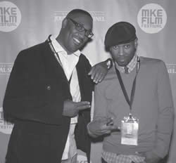 The native Milwaukee film duo share a fun moment on the step and repeat at the Oriental Theater in Milwaukee during the screening of their motion picture, ‘The Inevitable Defeat of Mister and Pete’. George Tillman, Jr. is on the left and Michael Starburry is on the right.