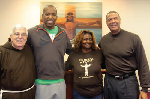 Former Milwaukee Bucks player Michael Redd returned to Milwaukee this week to formally announce his retirement from the NBA. Prior to the official announcement that took place at the Milwaukee Bucks vs. Cleveland Cavaliers game held on Wednesday evening, Redd returned to visit The House of Peace. While a member of the Milwaukee Bucks he was very supportive, he donated turkeys and holiday fixings for five years to the House of Peace Thanksgiving Food Basket distribution through the Michael Redd Foundation. His generosity allowed central city families the opportunity to enjoy a traditional Thanksgiving meal in their own homes. Pictured above during his visit are from (l to r): Father Perry McDonald, pastoral director, Michael Redd, Gerri Sheets-Howard, executive director and Skip Robinson, Milwaukee Bucks community outreach. (Photo by Robert A. Bell)