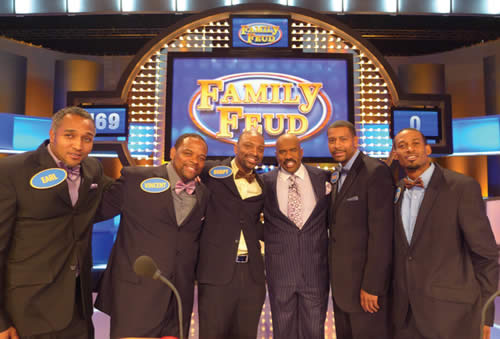 Pictured above on the set of The Family Feud are The Ivorys, from l to r; Earl, Vincent, Bumpy, the host Steve Harvey, Praylo and Teddy.