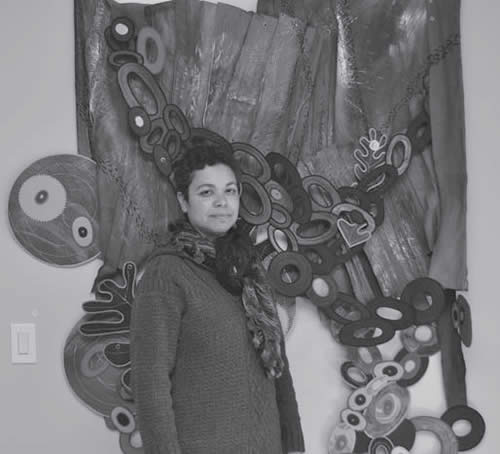 Sonji Hunt with one of her innovative fiber pieces, “Corseted Landscape: Fall” will exhibit her work at Jazele’s Art Studio for their upcoming event “Holiday Art Sale” on Saturday, December 7, 2013 from 10 am – 6 pm. Located in Riverwest, the address is 731 East Center Street, Milwaukee, Wisconsin. Along with the center’s regular exhibition, moderately priced seasonal items by Hunt and other artists, will be for sale to benefit Jazele’s Art Studio; a non-profit organization founded by visual artist Vedale Hill and his brother, Daren Hill. Jazele’s Art Studio specializes in youth programming for neighborhood children and cultural events for everyone. Della Wells, Christopher McIntyre, Vedale Hill, Kari Garon, Evelyn Patricia Terry, and Sherman Pitts are among the featured artists. Contact Della Wells at 414.379.5477 for questions. This event is free and open to the public.