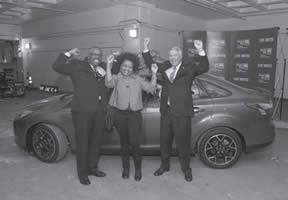 Pictured in Car Winner Photo are (L to R) – Chuck Harvey of Johnson Controls, Linda Stewart of Milwaukee winner of theGive and Win Sweepstakes prize: A NEW 2013 Ford Focus 4-Door Sedan SEL donated by Johnson Controls and Bruce McDonald of Johnson Controls.