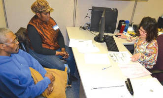 Tax Preparer Susana Azcueta fills out taxes for two Milwaukee residents during an earlier Super Saturday at SDC.