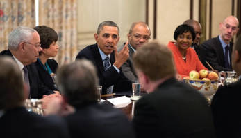 President Barack Obama meets with foundation and business leaders to discuss “My Brother’s Keeper,” an initiative to expand opportunity for young men and boys of color, in the State Dining Room of the White House, Feb. 27, 2014. (Official White House Photo by Pete Souza)
