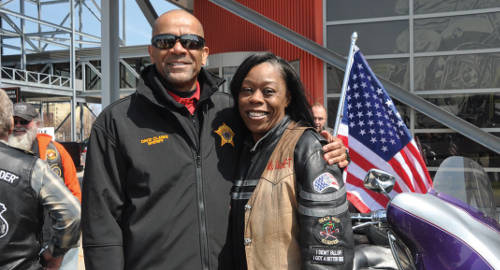 Sheriff Clarke held a Motorcycle Safety Awareness news conference on Wednesday in the lot of the Harley- Davidson Museum, attended by the local media and members of Rolling Thunder and ABATE of Wisconsin. Motorcyclists don’t have the protections… of airbags or seatbelts, and motorists need to be aware that the motorcycles need a full lane width, and to allow for more following distance. The sheriff warned against drivers using their cell phones, telling people to put down the phones and drive before they kill someone. Motorists need to check their mirrors and blind spots, and use their turn signals. The aim is to reduce the number of crashes and fatalities. Motorcyclists need to do their part as well. Training and experience is critical for rider safety. The sheriff warned against bikers riding between cars when traffic has slowed or stopped. The last two points he made were to have motorcycle operators take the safety training or tests necessary to obtain the motorcycle endorsement on the drivers’ licenses, and to NEVER operate a motorcycle while impaired. Drivers and riders – start thinking now about safely sharing the road together. (Photo by Sheriff’s Department)