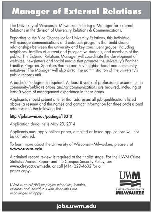 Share: Click to share on Facebook (Opens in new window) Facebook Tweet Click to email a link to a friend (Opens in new window) Email Click to print (Opens in new window) Print Position Open: Manager of External Relations at UW Milwaukee May 4, 2014 Share: Click to share on Facebook (Opens in new window) Facebook Tweet Click to email a link to a friend (Opens in new window) Email Click to print (Opens in new window) Print