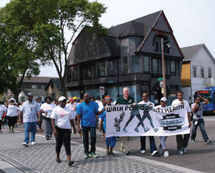 Also in the photo holding the banner from left to right is Christal West, Gregory Fanning – BHCW Board Chair, Janette Herrera and Jessie McSwain – BHCW Board Member. BHCW holds the African American Walk for Quality Health each year to engage the community in a meaningful healthy activity and to bring attention to the health disparities that plague the African American community. This event goes a long way in sending a positive message that African Americans indeed do care about their health as the event route is directly in the community that is adversely impacted by health disparities the most, the route started at the Milwaukee Urban League and ended at the Wisconsin Black Historical Society & Museum. The program at the end at the event included performances by the Jazzy Jewels and the African drum group Ajagun Arts, as well as a tribute to Dr. Maya Angelou. (Photo by Clarene Mitchell)