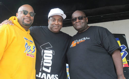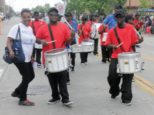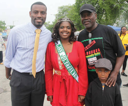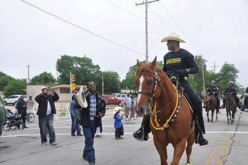 A parade-goer compares cowboy hats with the sheriff. (And the little guy next to him wears the same hat!)