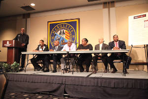 Caption: Panel -Eric Von, Founder of Brain Brawn.com, Ernest Colburn, RN Patient Care Supervisor, Wheaton Franciscan, St Joseph Campus, Darryl Davidson, City of Milwaukee Men’s health Manager, Harry Lewis, LCSW Psychotherapist, Nena Stanley, MD, Adult (Internal) Medicine Wheaton Franciscan-ST. Joseph Campus, O”rell Williams, MD, (Internal) Medicine/Hospitalist Wheaton Franciscan Medical Group, George Koonce Jr., PhD, Former Professional Football Player