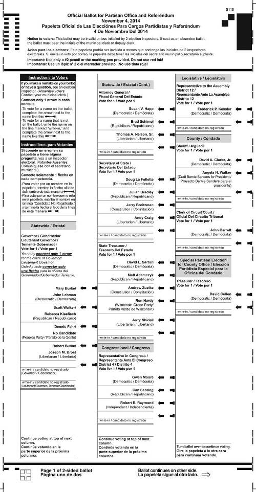 Notice is hereby given of a general election to be held in the several wards in the City of Milwaukee, Milwaukee County, on the 4th of November, 2014, at which the officers named below shall be chosen. The names of the candidates for each office to be voted for, whose nominations have been certified to or filed in this office, are given under the title of the office and under the appropriate party or other designation, each in its proper column, together with the questions submitted to a vote, in the sample ballot below.