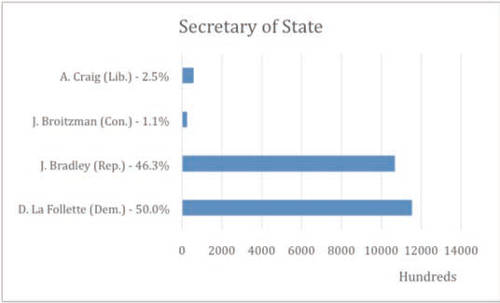 Democratic candidate, La Follette, narrowly won the position of Secretary of State by approximately 4 percentage points.