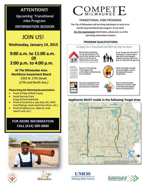 Share: Click to share on Facebook (Opens in new window) Facebook Tweet Click to email a link to a friend (Opens in new window) Email Click to print (Opens in new window) Print Transitional Jobs Program Information Session Jan 14 January 10, 2015 Share: Click to share on Facebook (Opens in new window) Facebook Tweet Click to email a link to a friend (Opens in new window) Email Click to print (Opens in new window) Print