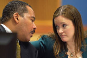 Dexter Scott King talks with attorney Nicole Wade during a hearing over who owns the Rev. Martin Luther King Jr.’s 1964 Nobel Peace Prize medal and traveling Bible on Tuesday, Jan. 13, 2015 in Fulton County Superior Court in Atlanta. King’s estate, which is controlled by his sons, last year asked a judge to order King’s daughter to surrender the items. (AP Photo/Atlanta Journal-Constitution, Kent D. Johnson)