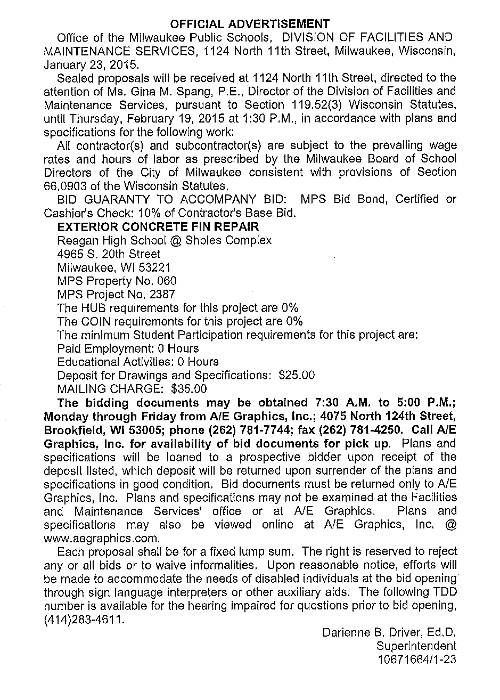 Share: Click to share on Facebook (Opens in new window) Facebook Tweet Click to email a link to a friend (Opens in new window) Email Click to print (Opens in new window) Print MPS Requesting BIDs for Exterior Concrete Fin Repair at Reagan High School January 30, 2015 Share: Click to share on Facebook (Opens in new window) Facebook Tweet Click to email a link to a friend (Opens in new window) Email Click to print (Opens in new window) Print
